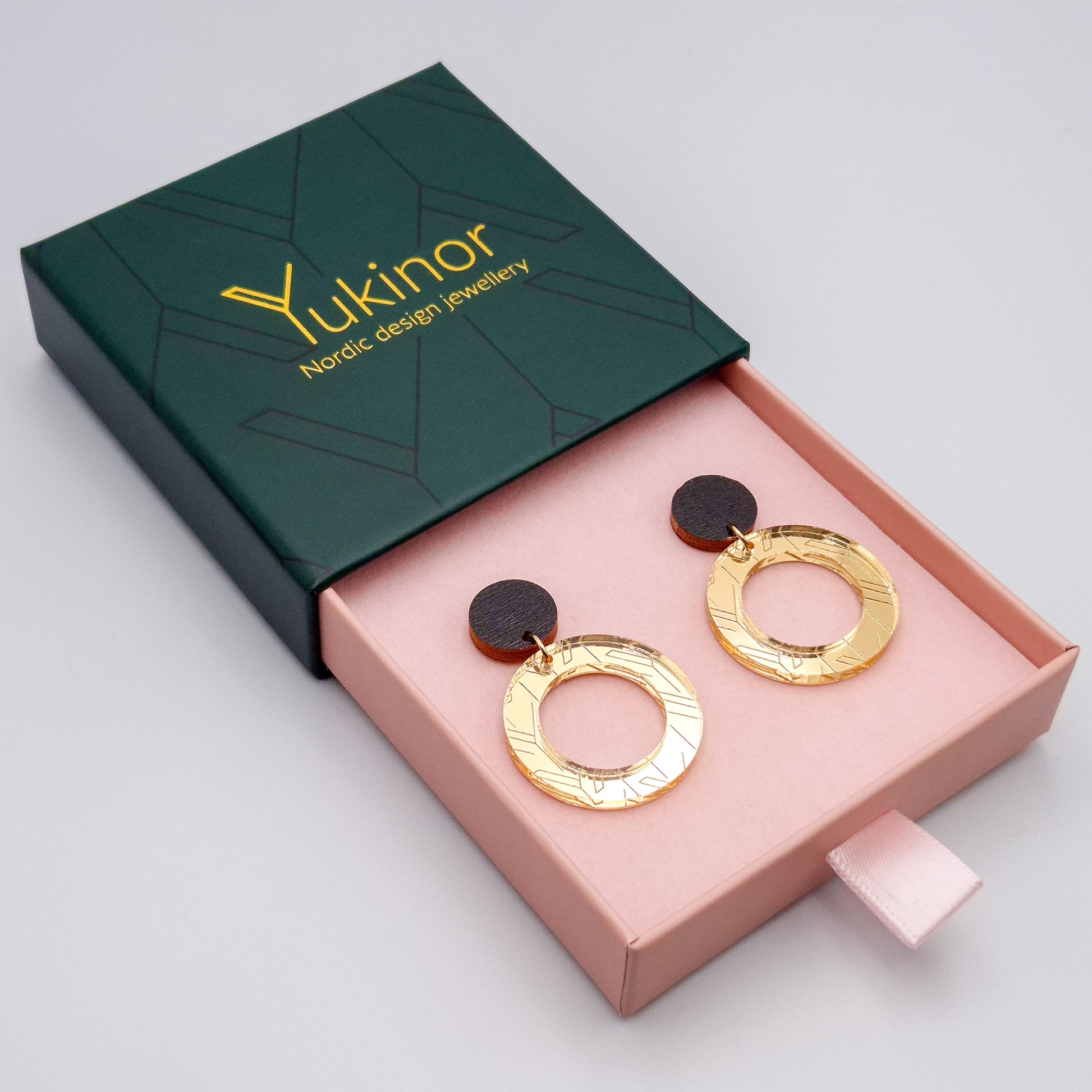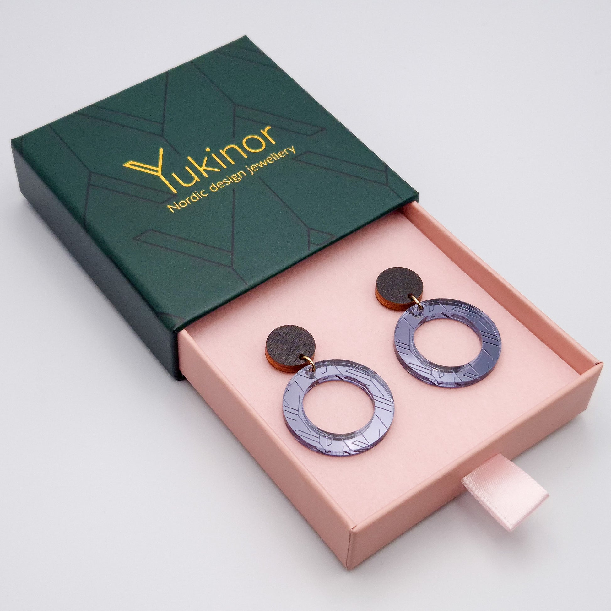 Our beautiful and unique Yukinor packaging includes a delivery box, earring box, and our thank you card. Our packaging is manufactured under FSC certificate and with FSC raw materials. In larger orders for consumers, a protective bag made of recycled plastic is also used as packaging material. Package delivery includes a tracking code when delivered to Finland. International delivery doesn't have a tracking code.