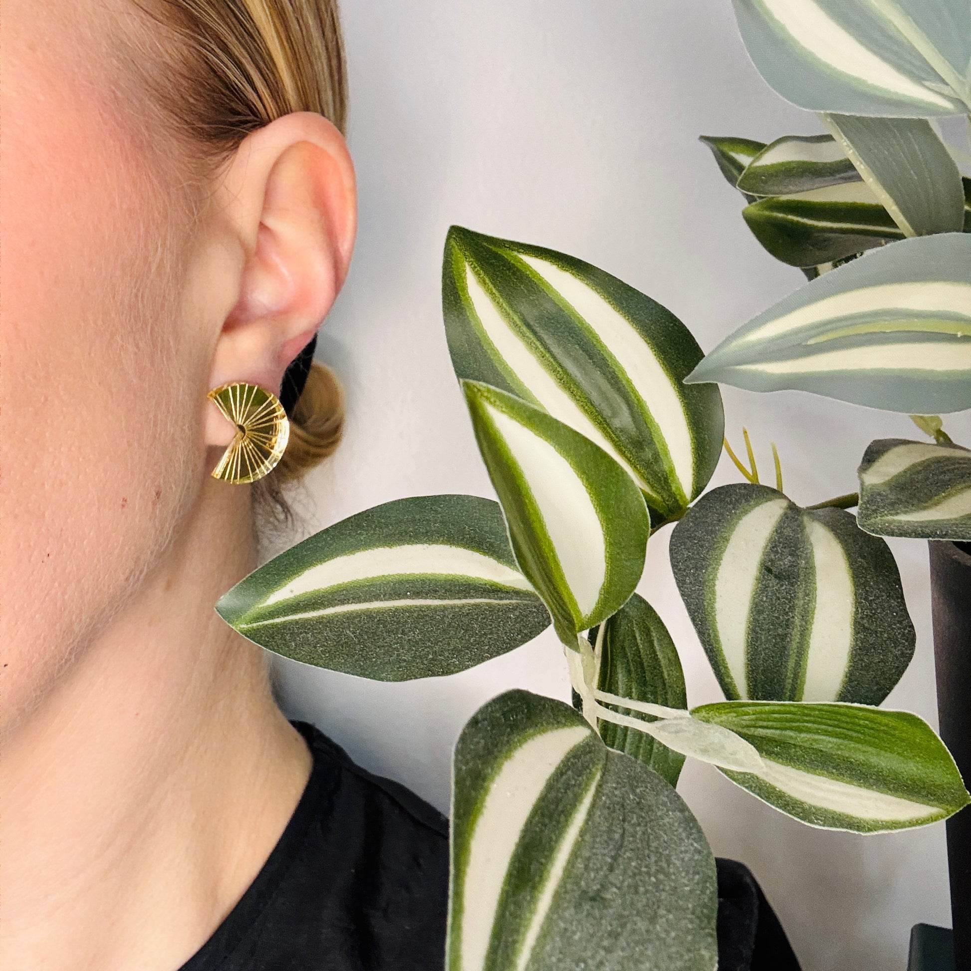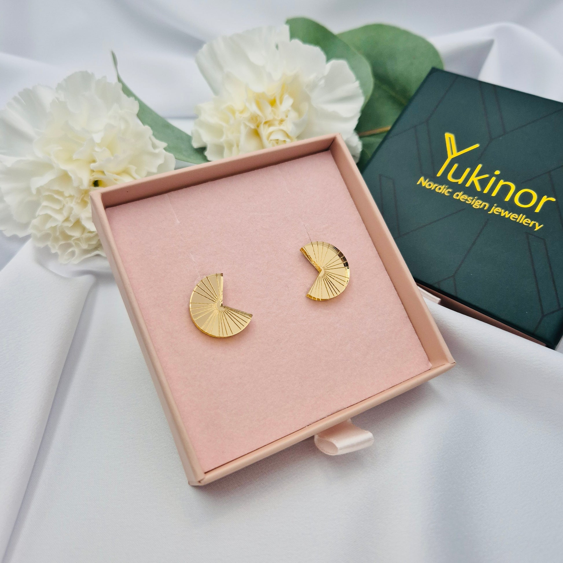 Inspiraatio Kata-korvakoruun muodostui viuhkan graafisesta muodosta. Yhdistelmä kimaltavaa peiliakryylia ja laserleikattuja kaiverruksia tekee Katasta näyttävän korvakorun niin arkeen kuin juhla-asujen koristeiksi. Kata minin väriksi on valittu Yukinorin kestosuosikki kulta.